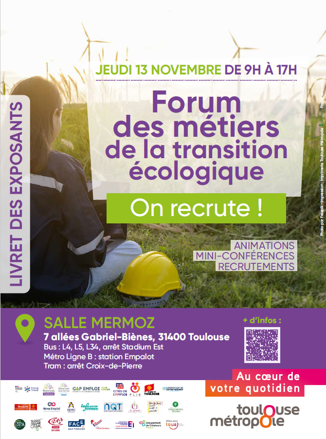Toulouse Métropole vous donne rendez-vous le 13 novembre 2025, de 9h à 17h, à la salle Mermoz (Île du Ramier) pour découvrir les métiers d’avenir au cœur de la transition écologique.